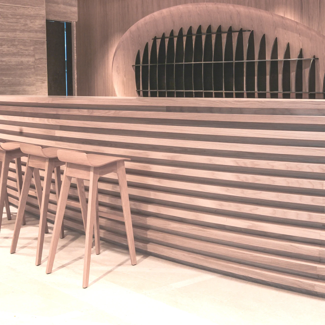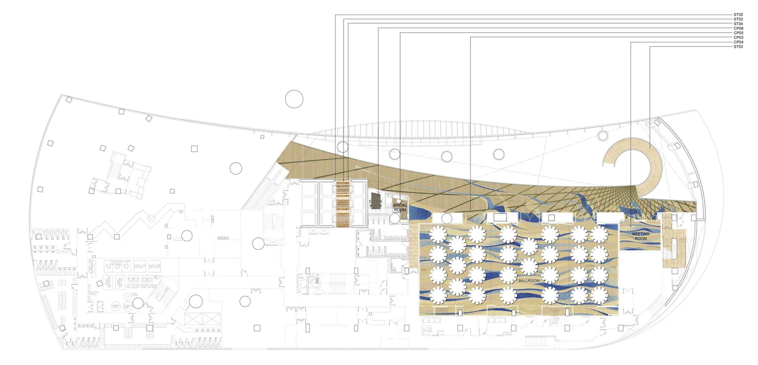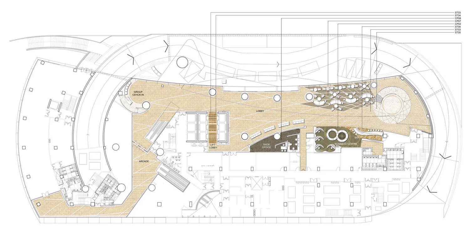 This is my first hotel lobby design and I thought it is much larger than most hotels' lobbies in Hong Kong.  It is very spacious, with lots of sunlight coming in, it would be totally our fault if the lobby was done bad, given that we have such a great space to design.  There are actually some standards written by Marriott that we have to follow, but mostly just in the reception desk, so they could place their equipment inside.  The center of stair is the base point of everything, the radiant pattern expands out, forming the slab edge of the first floor hallway above.  For materials, we went with soft limestone with bronze color metal as highlights at different areas.  All the walls in the lobby was cladded with 600 x 1200 x 40mm thick hanged Travertine stone panels.   The floors are layed with 25mm thick Santeony limestone.
