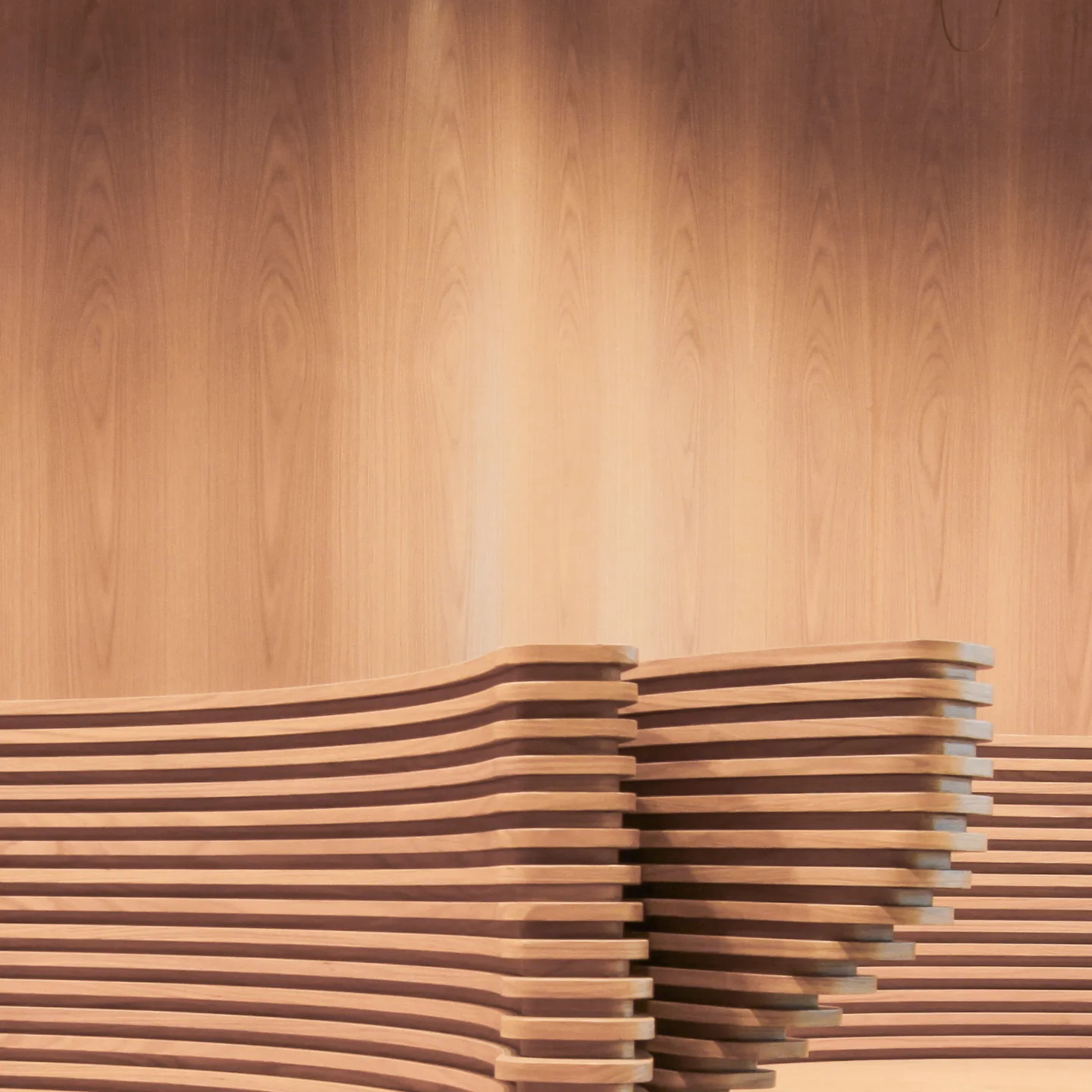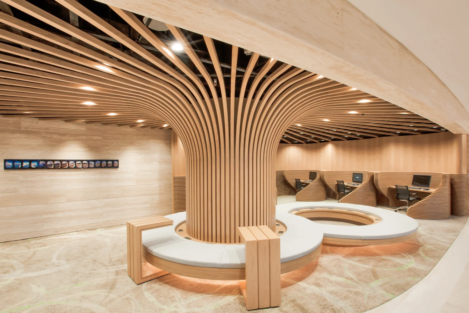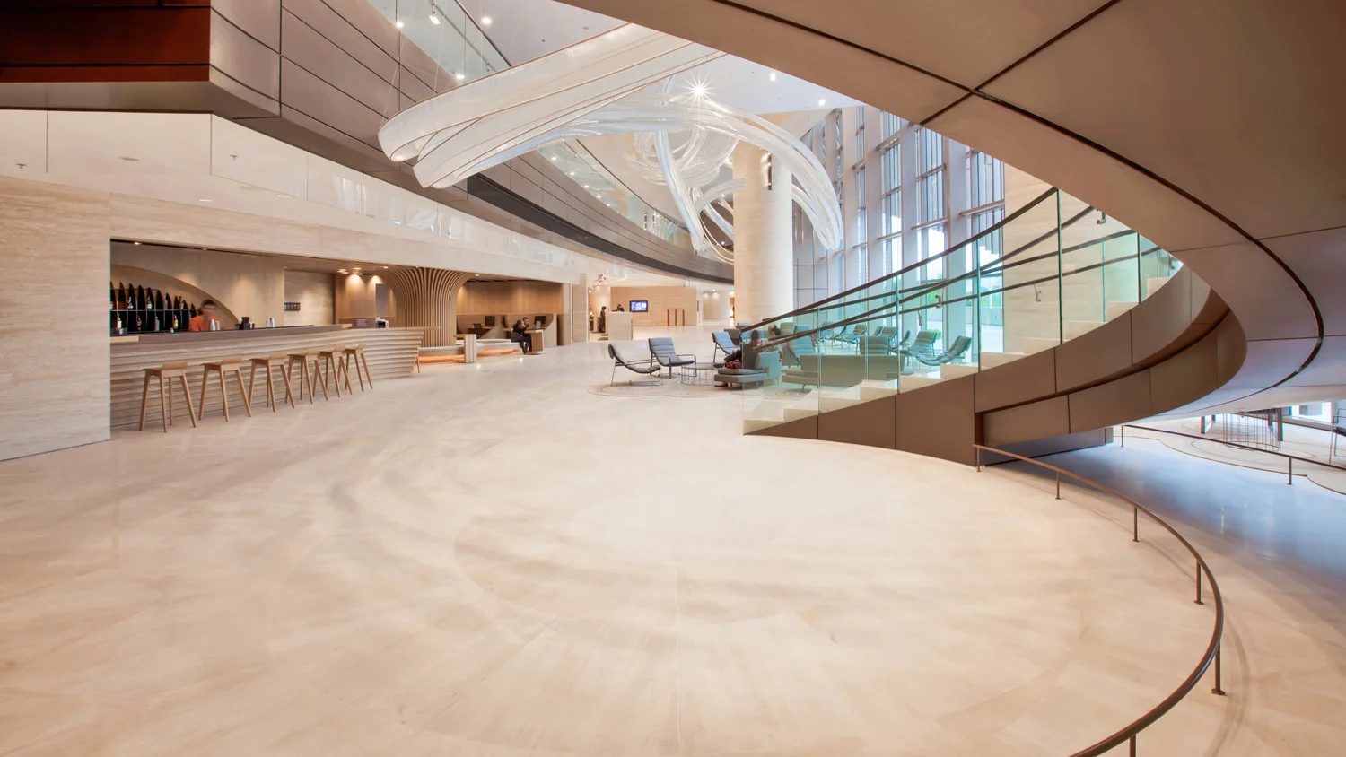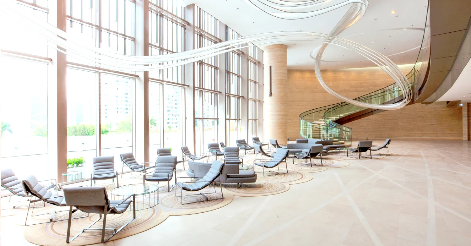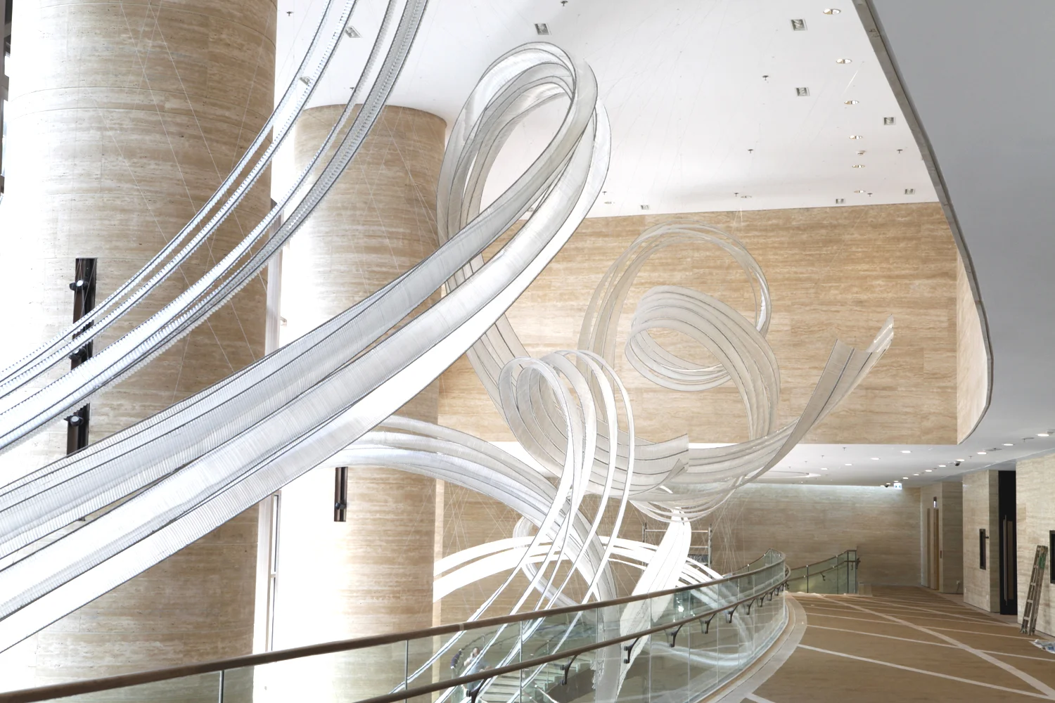 For the glass sculpture, we hired an artist called Nikolas Weinstein based in California, who did the fantastic design and installation with his team of people.  Thousands of glass tubes were tied by wires together to form a ribbon, seemingly floating freely on top of the lobby ceiling, it just created so much dynamics and they look the best at night with spotlights washing upon them.  There are hundreds of hanging wires suspended from the ceiling in order hold this sculpture in the air.  There are many other similar sculptures that installed in different countries, one of them is in Hong Kong in a Swire building and one of them in OPUS. His team were also very quick at assembling the sculpture.  I remember they could do it in matter of 2 to 3 weeks.