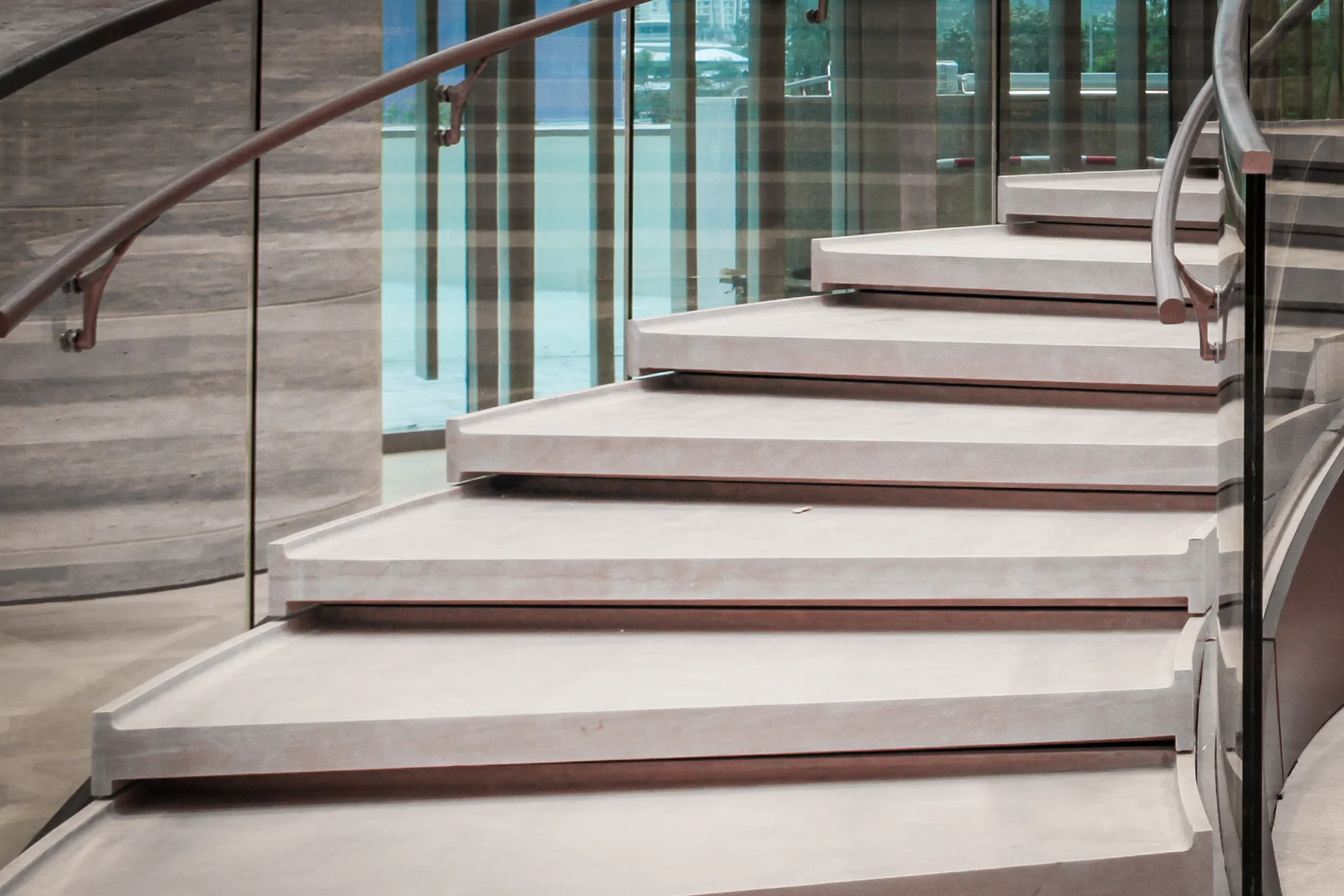 One of the main features of the lobby is the spiral staircase.  Since our love of I M Pei, we were inspired to his stair tread detail at the Louvre.  So we had our stone supplier to carve out the treads similar to that detail. This detailing, along with the 500mm deep treads, makes the stair looks very attractive and rich.   Stonework was just excellent.  The stair is held by two hollow steel tube at the bottom, is actually kind of shaky when you walk on it, but totally safe.  Even the cruved aluminum panels were done well, except that the joint widths are too big.  For interior panelings we should not be required to have such big movement and expansion joints, but we didn't know at the time.  However this is the best stair I ever done.