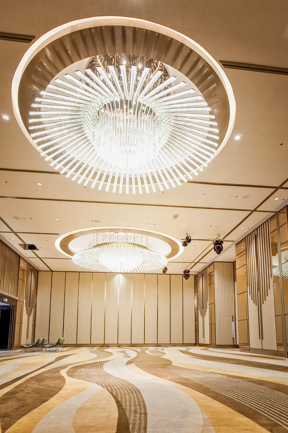 This suspended light is the star of the ballroom.  They are made with numbers of acrylic crystal with led strips inside each crystal.  They can all be dimmed according to different occation.