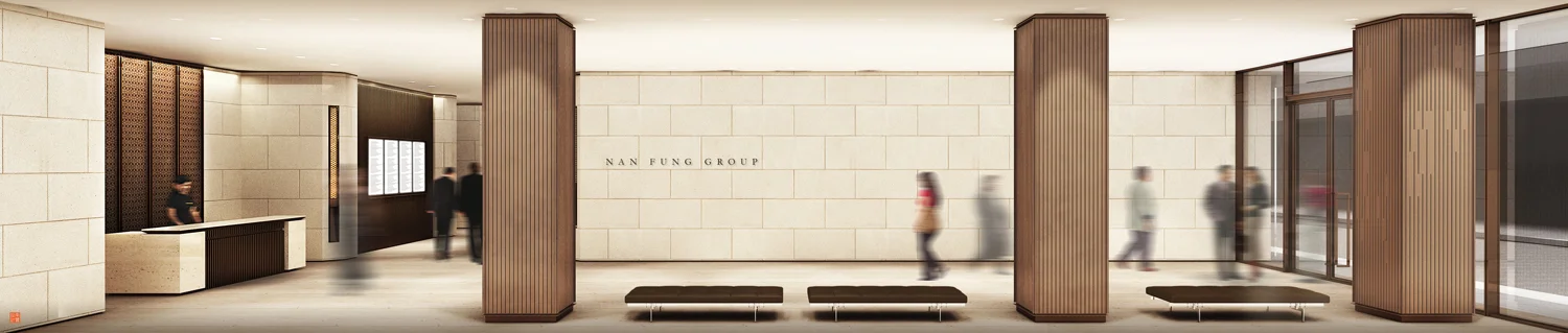 If you are a hongkonger and had shopped in the traditional Sincere department store, you would have probably guessed the building is called Sincere Tower, but actually the building is called Nan Fung Tower. The whole 25-storey building is owned by NF and renting out the podium to Sincere for more than 40 years. A few years ago the management decided to renovate the building podium and turning it into a grade A office. This project consisted of three major parts. First part is the office lobby, we relocated it to face Connought Road, enlarged it and enhanced it. Second part was to re-clad the whole facade of the podium, so it looks modern and fresh new. Third part was the shopping mall, to generate more activities and people. What I wanted to focus on is the main office lobby because that was the best part. It sounds like a small project but this is our headquarter so our team’s life and future relies upon it. Design took around a year to be approved, finally we went with modern classic style because we believed in timelessness. At the design stage we got a lot of comments saying this is like a hotel rather than an office, but at the end everyone including the tenants gave us very positive feedback.